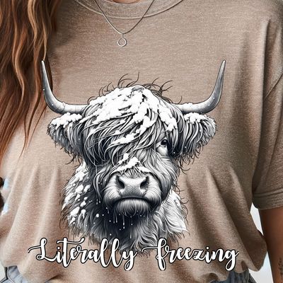 This grumpy Highland Cow, adorned with snow in its shaggy hair, offers a distinctive blend of rugged charm and whimsical appeal, ideal for winter-themed apparel or year-round fashion statements.